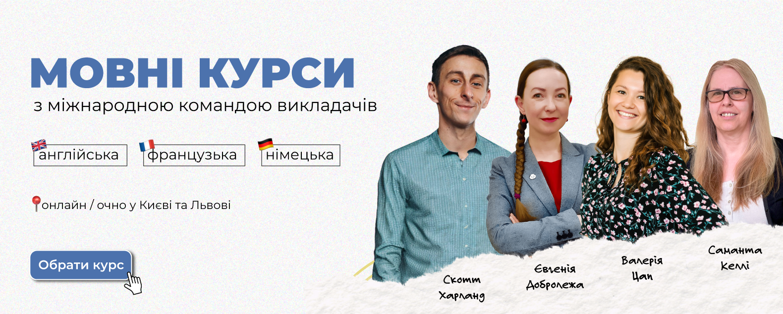 Курси для дітей та дорослих; онлайн або очно у Києві та Львові; англійська, французька або німецька. Пройдіть безкоштовний тест на визначення рівня вже сьогодні!