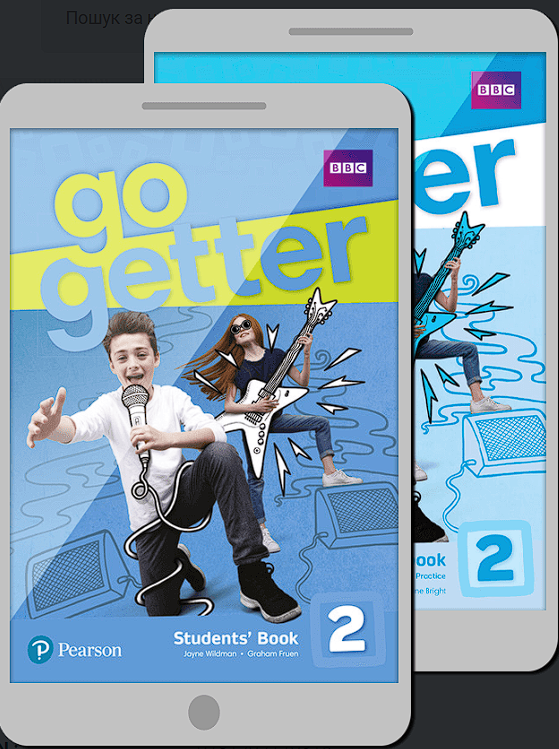 Основний підручник, який ми використовуємо на даному курсі - Go Getter 2. Підручник розроблений міжнародним видавництвом Pearson відповідно до найсучасніших технік і методів викладання англійської мови. Він поєднує читання та аудіювання з вивченням граматики, лексики та різними комунікативними завданнями. Go Getter 2 також містить цікаві відео з каналу BBC, щоб Ваша дитина познайомилася з культурою англомовних країн та автентичною мовою.