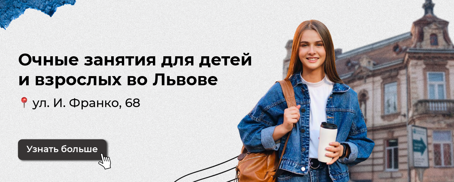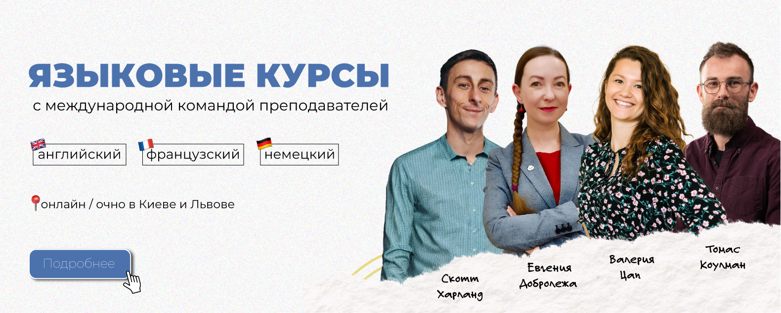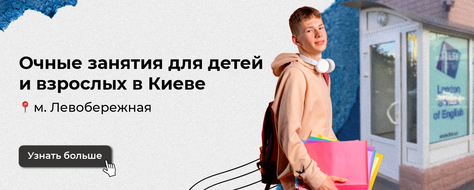 Мы предлагаем курсы английского языка для детей от 6 лет, подростков и взрослых. Группы формируются по возрасту и уровню знаний. Занятия проходят онлайн или очно в Киеве (м. Левобережная, ул. А. Шептицкого, 14) и Львове (ул. И. Франко, 68). В школах есть укрытия.